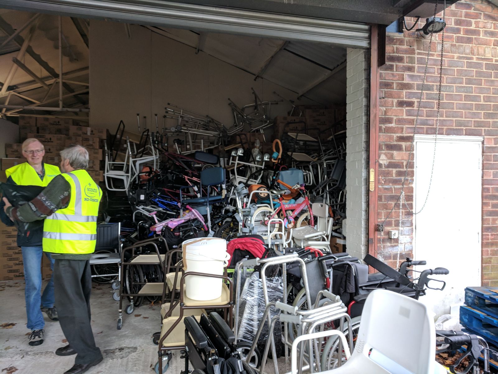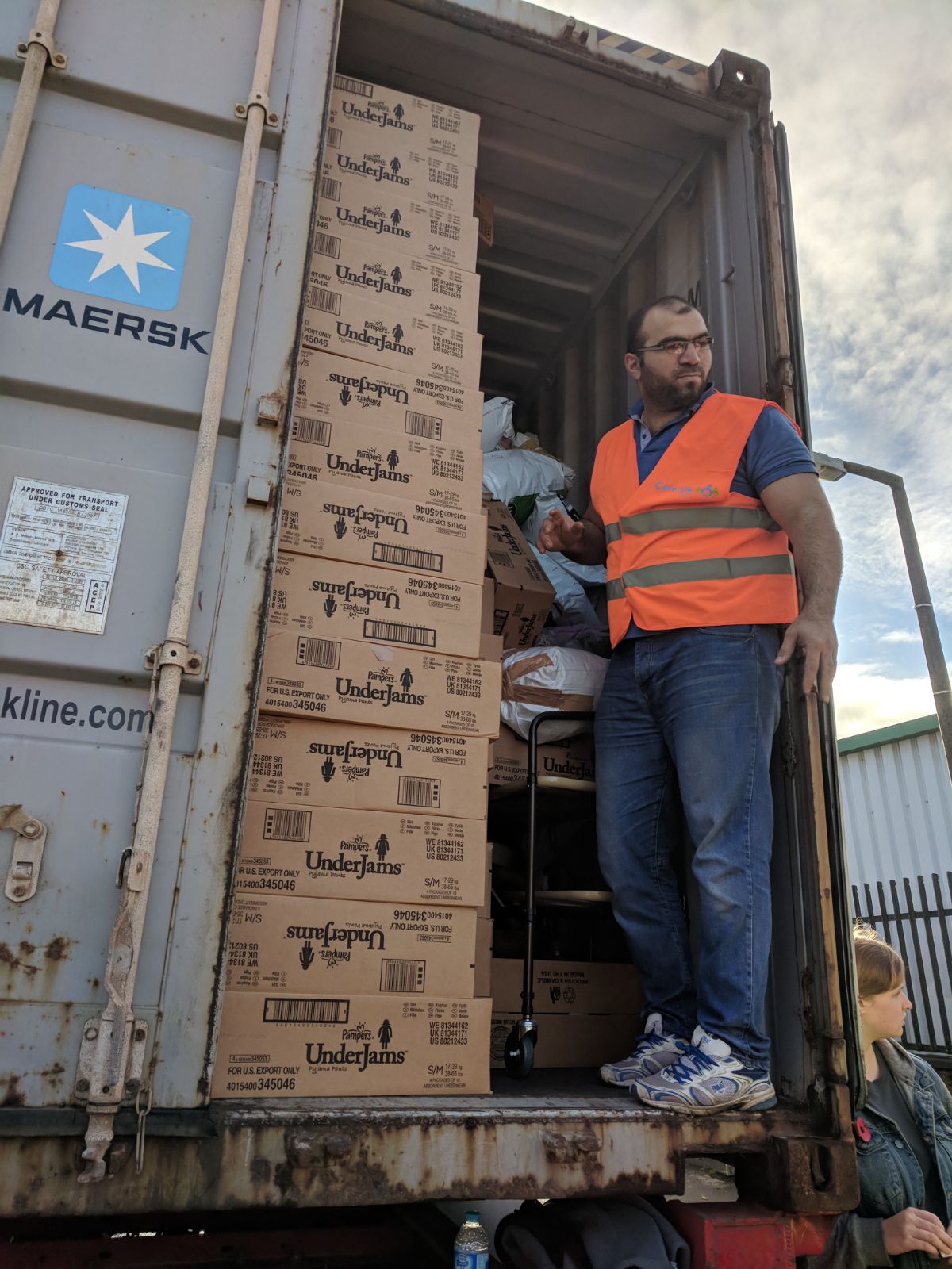 Amarr, “the Top Banana,” was in charge of loading the container with the supplies that were desperately needed, particularly the medical aids such as crutches, wheelchairs, zimmer frames and commodes, which, as you can imagine are very difficult to pack! The Explorers will be pleased to know that, with the exception of a small number of commodes which are destined for Greece, everything went! As did the boxes and boxes of Underjams. We actually saw a space in the loading bay! Mind you, once the container was full to the brim and the doors closed, Sue and her team lost no time in re-organising the loading bay with bags of sorted items ready for the next container!